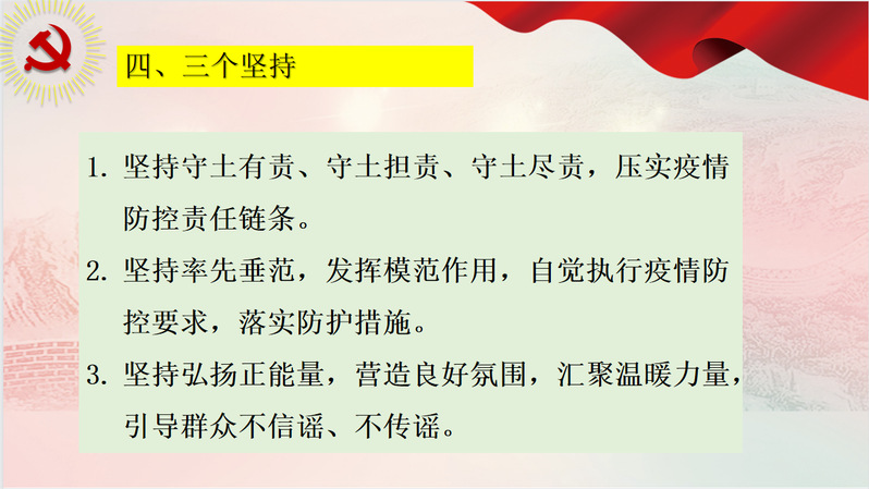 会议最后,党支部副书记王晟老师要求全体党员坚守初心,率先垂范,发挥模范作用,自觉执行疫情防控要求,落实防护措施,按照学校和社区的部署,积极响应号召,按照驻地的统一安排,以志愿者身份投身疫情防控,彰显一名党员的责任和担当。要弘扬正能量,营造良好氛围,汇聚温暖力量,努力形成“榜样的力量”。党员要不信谣,不传谣,发挥作用,将信仰、坚定的意识、正能量的言行发扬。各部门主管要坚持守土有责、守土担责、守土尽责,压实疫情防控责任链条,做好本部门教职工的关心、沟通、各项数据的及时报送,充分发挥主人翁态度,共同守护好闵行校区。