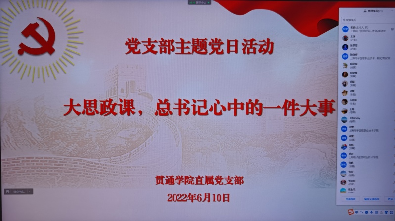 2022年6月10日,贯通学院直属党支部以在线会议形式开展大思政课总书记心中的一件大事主题党日活动,贯通学院全体党员参加会议,会议由党支部副书记王晟主持。
