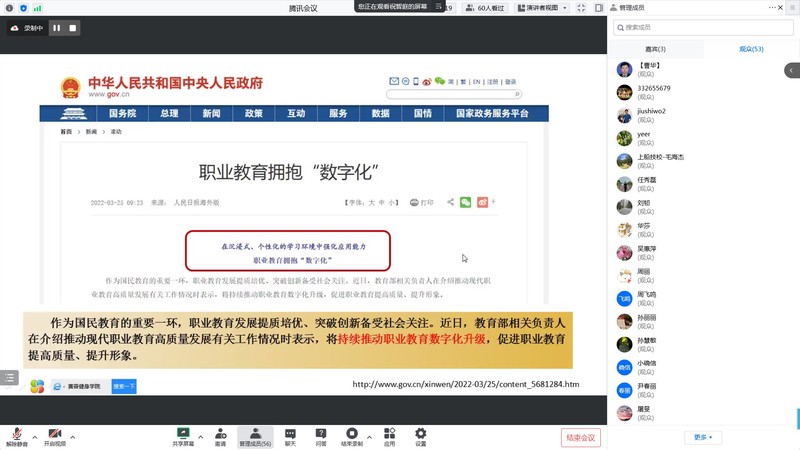 近期,贯通学院直属党支部把学习宣传贯彻党的二十大精神作为首要政治任务。11月17日晚7点,贯通学院邀请华东师范大学终身教授、教育技术学博导、享国务院特殊津贴专家、教育部教育信息化技术标准委员会主任祝智庭老师在线开展题为《职教数字化转型的发展机遇与行动建议》的专题辅导报告,我院教师、兄弟院校同仁、行业专家共计八十余人共同聆听学习了本次专题辅导报告,深入学习领会党的二十大精神。
