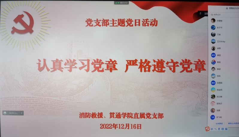 2022年12月16日,消防救援、贯通学院直属党支部在线开展“认真学习党章 严格遵守党章”主题党日活动,消防救援、贯通学院全体党员参加,党支部书记王晟老师主持。