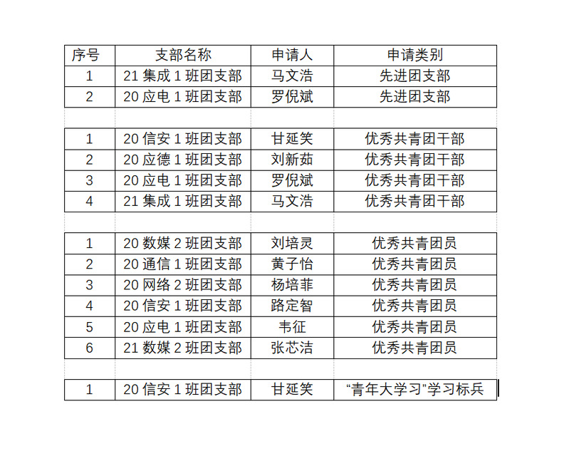 为了全面贯彻习近平新时代中国特色社会主义思想,根据共青团中央全团大抓基层、全面从严治团和深化学校共青团改革的工作部署,落实习近平总书记关于青年工作的重要思想和关于教育的重要论述,认真学习贯彻党的二十大精神,着力提升我院共青团组织力、引领力、服务力和大局贡献度,继续深化高校共青团改革、严肃团的纪律,营造昂扬向上、团结奋进的良好校园氛围,团结引领广大团员永远跟党走,奋进新征程,发挥团员在青年学生中的示范带动作用,成为新时代的奋斗者。按照上海电子信息职业技术学院关于评选2022年度五四红旗团(总)支部、先进团支部、优秀共青团干部、优秀共青团员、“青年大学习”学习标兵的通知要求,经各班推选,团总支组织评优工作小组审核,现将名单公示如下: