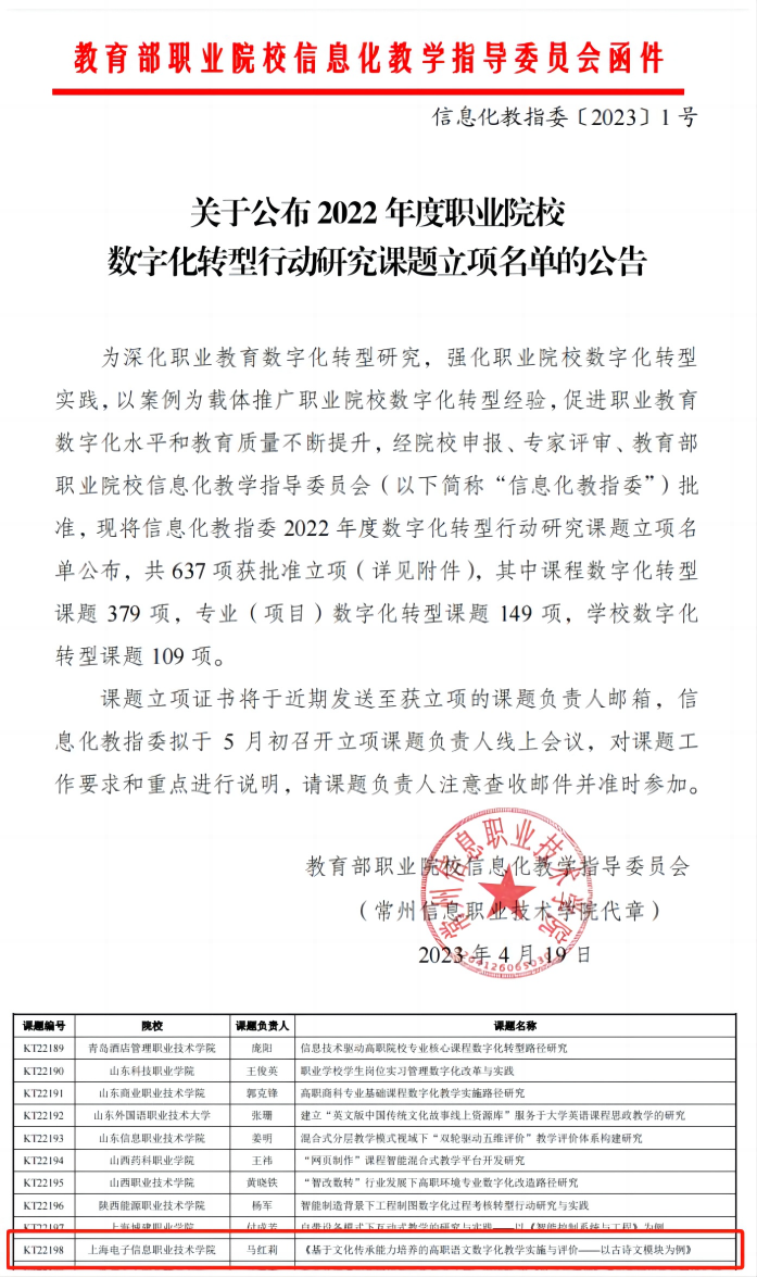 消防救援、贯通学院马红莉老师主持申报的2022年度职业院校数字化转型行动研究课题“基于文化传承能力培养的高职语文数字化教学实施与评价——以古诗文模块为例(课题编号KT22198 学校申报、专家评审、教育部职业院校信息化教学指导委员会批准,成功立项。