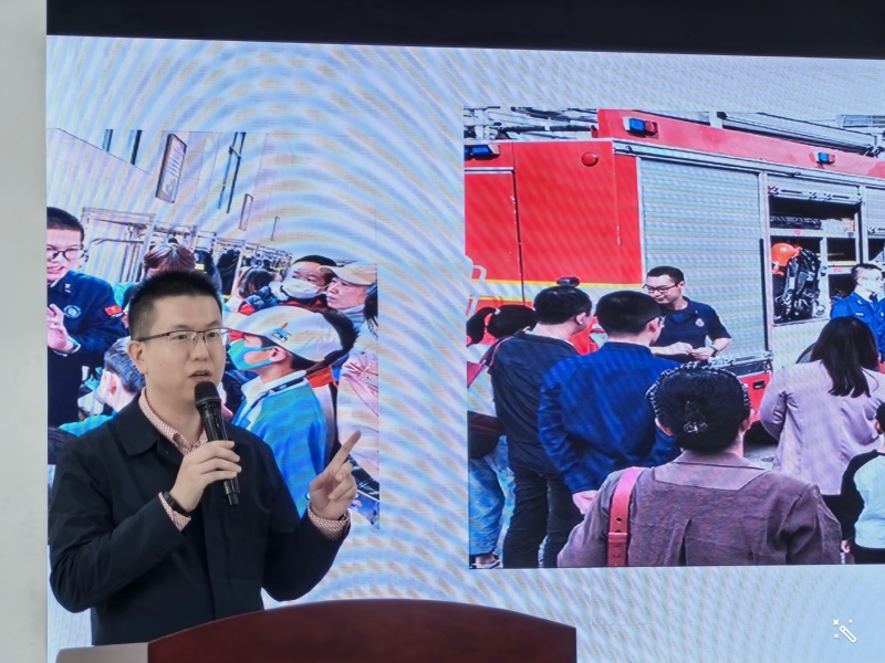 张豪介绍了22消防救援1班8位学生自从去年10月以来,在长达七个月的讲解员聘期中,每周六赴闵行消防救援站开展志愿服务的情况。在长期的志愿服务实践中,8位学生的综合能力有了明显的提升,其中有5位同学参加并进入上海市大学生创课大赛市级决赛前二十名,为学校和班级争得了荣誉。张豪强调第一批消防志愿者的任务已经圆满完成,志愿服务的接力棒交到了23级学生手中,希望广大同学积极奉献爱心,让志愿服务之光更加闪耀,让向上向善更加蔚然成风,为奋力谱写中国式现代化建设新篇章持续提供强大精神力量。