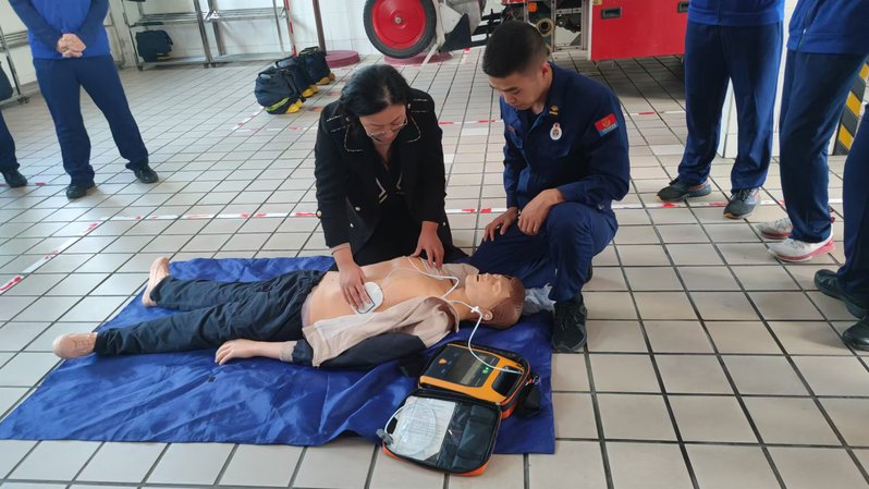 在实践环节,消防员向大家展示了现场急救技术、心肺复苏术、AED使用方法、紧急情况下破拆自救等重要技能。随后,老师们实践了用破窗锤击碎车窗玻璃、用破拆剪剪断钢筋、用消防斧破开门板等多种自救及救援方法。通过实际操作演示和互动指导,大家迅速掌握了应急救援方法。