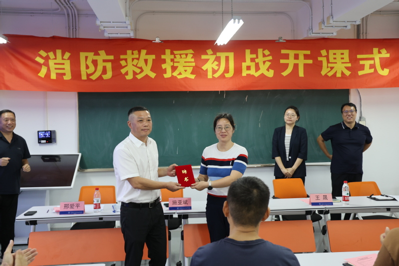 消防救援与贯通学院院长王晟和上海市消防安全服务有限公司负责人共同为实践教学基地揭牌,并代表学院向施亚斌先生颁发校外专业指导专家聘书。副院长张亮介绍了课程相关内容。