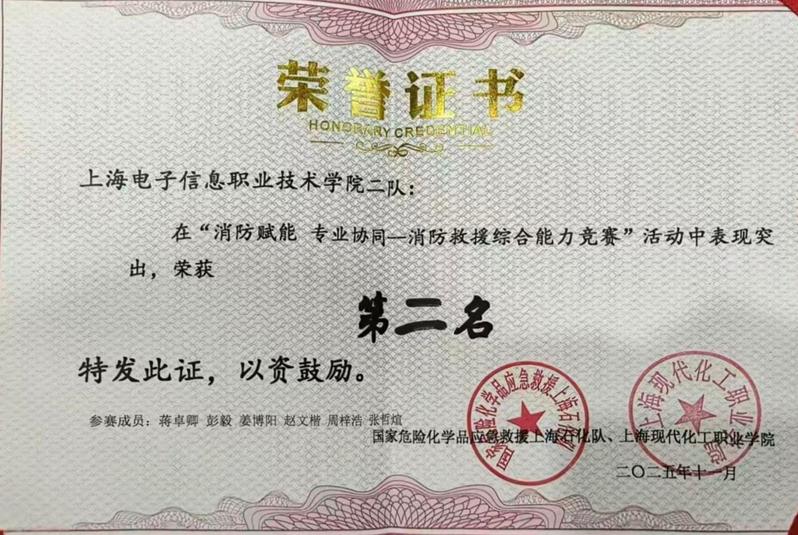 11月20日,我校消防救援专业学生在消防救援能力综合竞赛活动中获得二等奖、三等奖!本次活动由国家危险化学品应急救援上海石化队、上海现代化工职业学院、上海电子信息职业技术学院、上海市市北职业高级中学联合举办,我校学生凭借过硬技能水平和奋勇争先的精神风貌斩获佳绩。